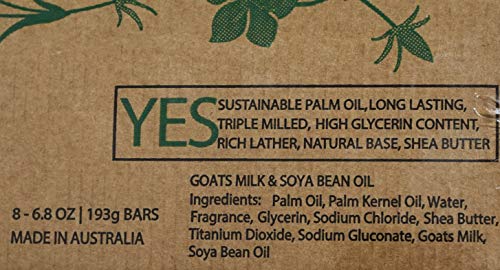 *Goats Milk and Soya Bean Oil. *Triple Milled, High Glycerin, Rich Later and Natural Base. *No Sulphates and Phthalates. No Testing on Animals. No EDTA. *Ideal for Use on Face and Body. *Size: 6.8 OZ (193g) Each Bar.