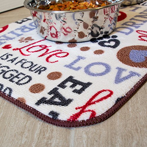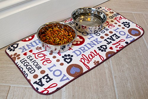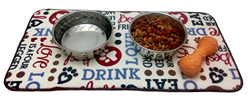 Eliminate the mess under your dog or cat’s food and water bowls with this absorbent microfiber mat. It has a cute design that any pet owner would love. Your floors will stay cleaner as this mat keeps food debris and water spills contained. The anti-skid backing prevents your pet from pushing the mat across the floor as he eats. The mat accommodates bowls 5 inches to 7 inches in diameter.